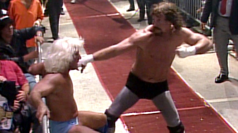 Funk faces immediate comeuppance for his brazen declarations as Flair drops him with an inverted atomic drop. Flair cannot capitalize on the maneuver as Funk holds the ropes on an Irish whip and returns with a swinging neckbreaker. Terry Funk feels powerful now, and shows it with a series of taunting slaps to Flair’s face. This wakes up the Nature Boy, who chokes Funk and sends him scrambling to the outside with a flurry of chops. The once brash and menacing cowboy now cowers with fear. Flair fights back with every ounce of strength, the chops ringing out across the arena as he turns the tide of the match with urgency and intensity, even getting physical with Funk’s manager Gary Hart.