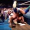 Before the match begins, Jim Ross declares that if Flair can make Funk say “I quit”, Funk will shake Flair’s hand and call him the better man. Terry Funk then grabs the house microphone and gives Flair the opportunity to quit before the match begins. Flair declines and a strong lockup sends them bouncing around the ring. A single Flair chop leaves Funk fuming on the outside as he throws errant punches at fans and stalks around ringside in a mad haze. Flair controls the momentum as they brawl around ringside with an array of chops and strikes. Back in the ring, Funk finds an advantage and lays down stomps. Now in control, Funk continues with strikes and shoots Flair into the guardrail. He posts him in the corner and attacks him with punches all the while begging Flair to quit. Throughout, the use of the microphone presents an auditory experience that is subdued in most matches. Along with Funk’s wild punches, we hear the desperation in his voice. Chaos created through sensory overload.